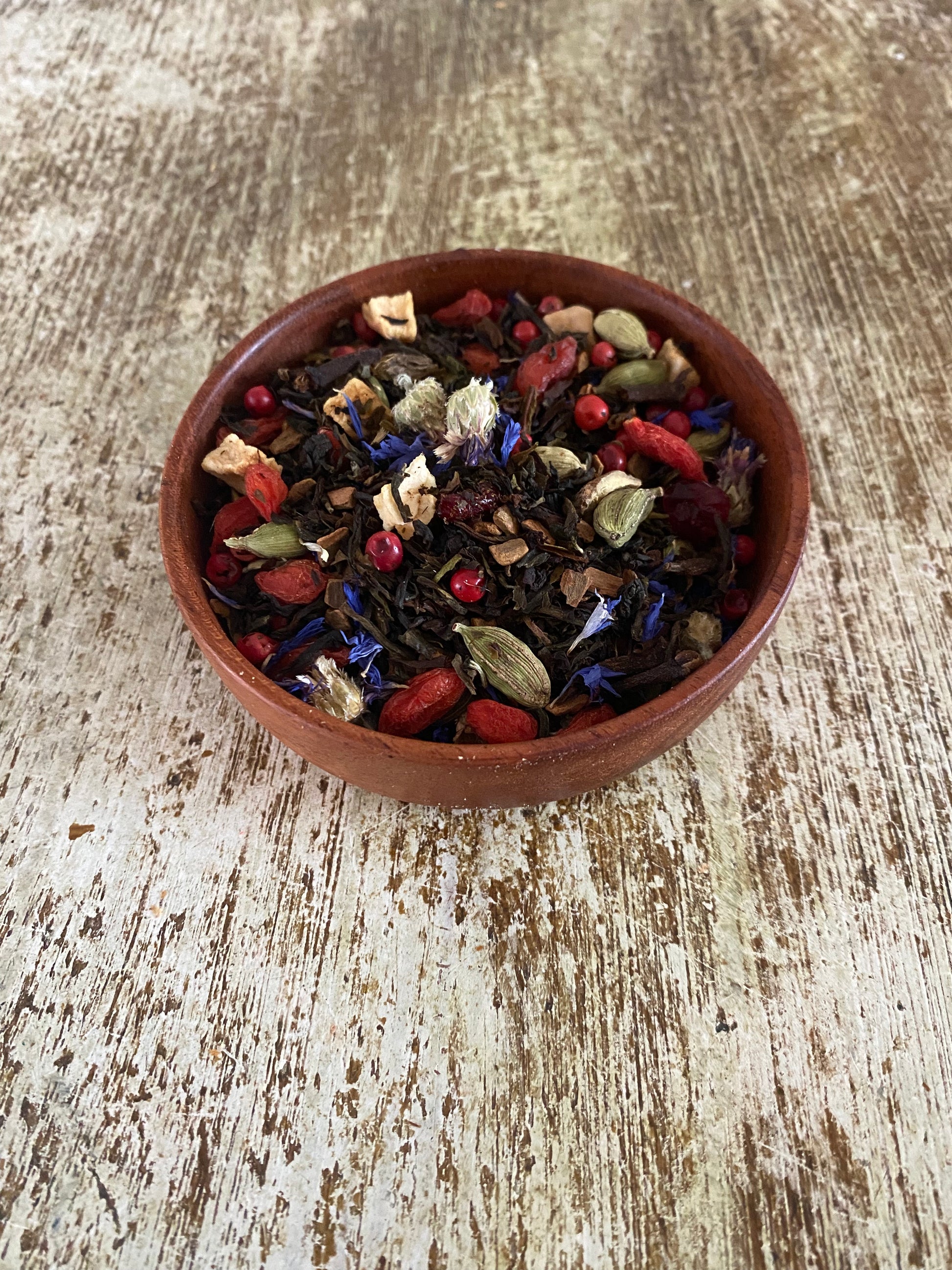 Appel, Cranberry, Earl Grey, Gojibessen, Kaneel, Kardamon, Korenbloem, Kruidnagel, Roze Peper, Zoethout